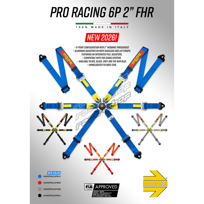 The MOMO PRO DRIVER 6P 2”/3” FHR Racing Harness is engineered for drivers who demand uncompromising safety and control. Developed to meet the rigorous FIA 8853‑2016 standards, this high-performance 6-point harness is designed to deliver maximum protection in professional motorsport environments.