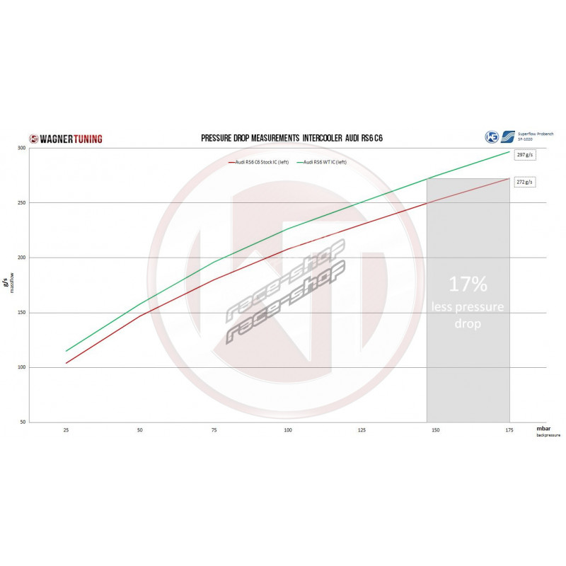 A WAGNERTUNING nagyteljesítményű intercooler új versenymagot (csőorrot) kapott, amelyet kifejezetten az Audi RS6 C6 C6 magas követelményeihez fejlesztettek ki. Az újonnan kifejlesztett HD-Fin típusunk a lehető legjobb teljesítményt biztosítja. Az egyes intercoolermagok külső méretei: 283 mm x 225 mm x 90 mm + 283 mm x 193 mm x 55 mm (lépcsős mag: 8,73 liter) / 11,14Inch x 8,86Inch x 3,54Inch + 11,14Inch x 7,6Inch x 2,16Inch (lépcsős mag: 532,74Inch³) Ez a nagyteljesítményű mag 79%-kal nagyobb magtérfogatot kínál a széria intercoolermaghoz képest.