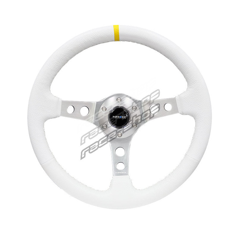 NRG Megerősített 3 küllős bőr kormány lyukakkal, (350mm), fehér/ezüst/sárga