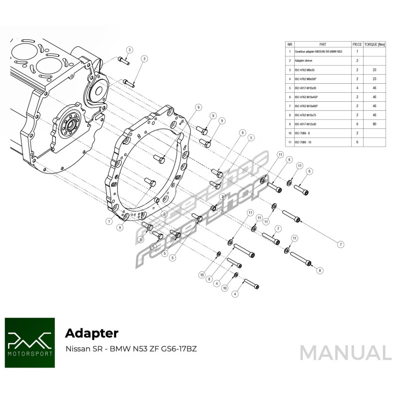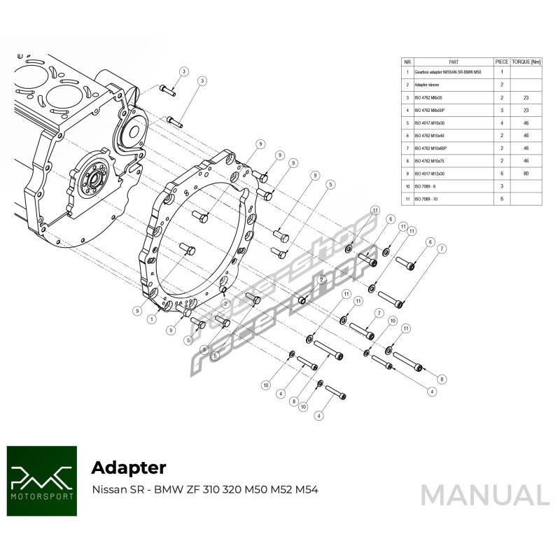PMC Motorsport adapterlemez (sebességváltó adapter / sebességváltó adapter)Nissan SR SR20 - BMW ZF310 / ZF320 / ZF GS5-39DZ / Getrag420G / ZF GS6-37DZ / ZF GS6-53DZ HGK HGU JGA HGD HGA JGL / GS6-53BZ / Getrag DCT DKG GS7D36SG inline-six / ZF 8HP70Küldje el kérését vagy kérdését