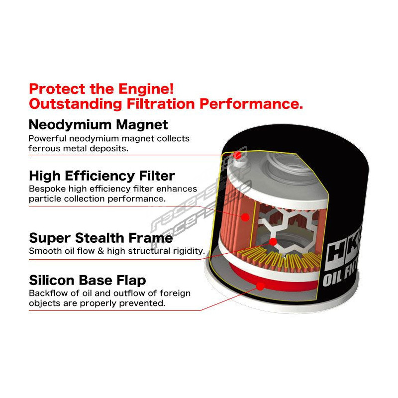 A HKS által fejlesztett olajszűrők egyetlen dolgot tartanak szem előtt: a teljesítményt. Az eredeti szűrőkhöz képest akár 30%-kal nagyobb áramlási sebességet biztosítanak, és korlátozzák az olajnyomás csökkenését. A motor kenése javul, miközben megmaradnak a kivételes szűrési tulajdonságok: egyszerűen ez a legjobb olajszűrő, ami sportkocsikhoz kapható..