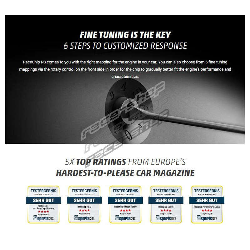 A RaceChip® autóipari szoftver-módosító cég, 1994 óta kiegészítő egységekkel. Ezeket a kiegészítő egységeket a motor és a gyári motor vezérlőegység között kell beszerelni. Ennek a terméknek a funkciója a vezérlőegység jeleinek vétele és értékelése (másodpercenként több ezer alkalommal), majd módosítása a teljesítmény növelése és optimalizálása érdekében. A telepítés nagyon egyszerű (10-15 perc alatt), és az új járművekre vonatkozó garancia elvesztése nélkül. A cég termékei nem zavarják az autó alapvető rendszerét, amely az összes eredeti funkció aktív marad. A RaceChip® TÜV tanúsítvánnyal rendelkezik 2009 óta