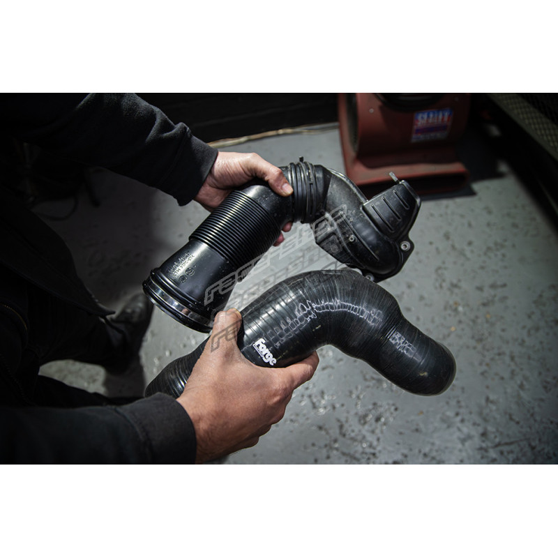 Az FMTIA13 megerősített, többrétegű szilikonból készül, amely tartósabb, mint az OEM műanyag cső, és nem szenved a hőelnyeléstől, mint a fémtermékek. Megnövelt kapacitása és kevésbé szűkítő felülete a levegőt közvetlenül a turbófeltöltőbe vezeti, így nagyobb mennyiségű levegő sűríthető. Ez kedvezően befolyásolja a jármű gyorsulását hosszú lassítás után vagy a sebességváltások között, mivel több levegőt tart a turbófeltöltő bemeneti csatornájában.